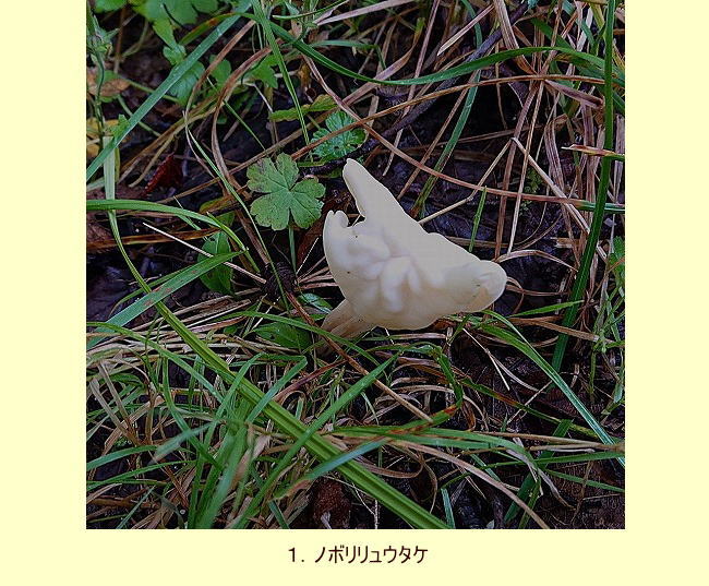 奥日光の湯滝駐車場近くの草地に珍しい形の白いキノコらしきものが数本発生しているのを発見、ガイド仲間の(I君)いわくノボリリュウタケとのこと。